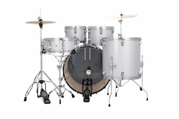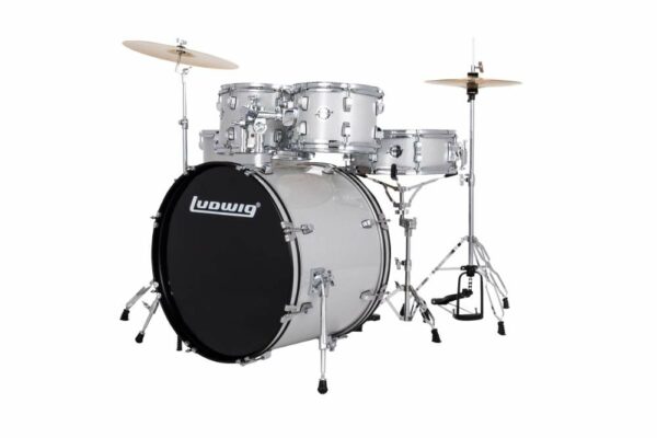 Ludwig Accent Drive 22″ 5 Piece Drum Kit with Hardware, Throne and Cymbals – Silver Sparkle
