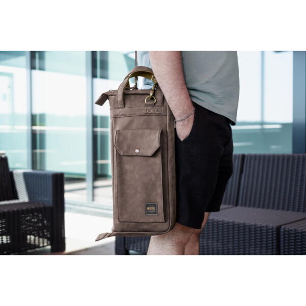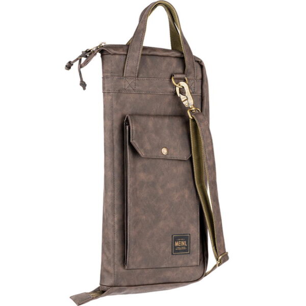 The Meinl Vintage Hyde Stick Bag has all the tough useability of a touring bag with classic good looks. Our ultra-durable leatherette exterior and 24-ounce cotton canvas interior maintain a lifetime of use. Inside the main compartment are five pockets to organize a large number of drumsticks, brushes, rods, and mallets. Plus, there are three different-sized accessory pockets to accommodate smaller parts or sound effects. This stick bag comes equipped with length adjustable floor tom hooks and straps to suspend it in an open position. The large exterior quick-access pocket is sized for common accessories or tools, and it snaps shut to secure your items. An adjustable/removable shoulder strap and reinforced leatherette handles let you comfortably transport this bag to the gig or studio. Getting into the bag is easy with the large zipper pull tabs that come with long leatherette draws. The Meinl Vintage Hyde Bags are designed for an understated and timeless style while being as practical as ever for any type of traveling drummer. Available in Black, Dark Brown, or Light Brown.