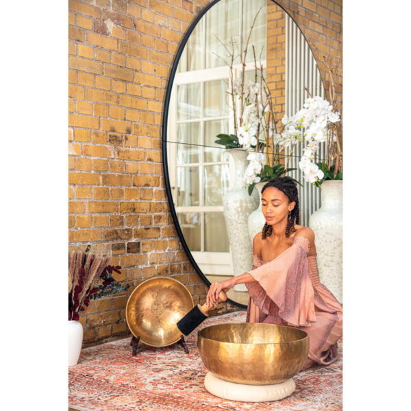 The Meinl Sonic Energy Grounding Series Singing Bowls are extraordinary masterpieces of craftsmanship and sound. These giant and rare singing bowls are perfectly suited for sound therapy, producing deep tones, powerful vibrations, and a long sustain from the large diameter. You can also experience the unique sensation of the vibrations flowing through your body by standing inside the bowl as it’s played with a mallet. These bowls are made in India from a special bronze alloy and hand-hammered into shape by metal artisans to produce their vibrant sound. The singing bowl is great for starting a sound massage, "grounding" the participants and promoting body awareness and blood circulation. To play, we recommend our Grounding Singing Bowl Mallet (model no. SB-PM-XXL) with an extra-long handle and fleece head (mallet sold separately). Includes a buckwheat singing bowl cushion.