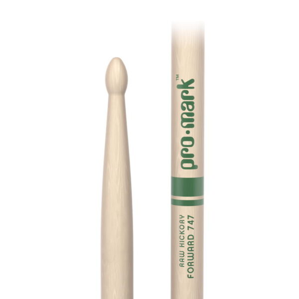 The ProMark Classic Forward 747 Raw Hickory drumstick offers added reach, power and natural feel for drummers who demand control and comfort. With its medium-thick diameter, short taper, and oval wood tip, this stick delivers a forward-weighted feel ideal for louder musical styles. The raw finish provides an uncoated, sanded texture that enhances grip and maintains a natural connection between the stick and the playerโs hands.