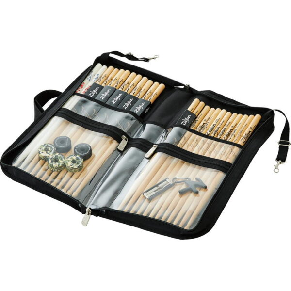 This deluxe stick bag is ideal for drummers who want to carry a wide selection of sticks while keeping accessories organised and easy to find. The hanging straps allow the bag to attach easily to a floor tom, keeping sticks within reach during rehearsals or live performances.