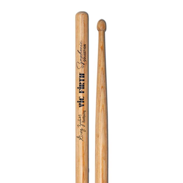 The Vic Firth Greg Zuber “Nothung” Signature Snare Drumsticks bring a bold, powerful voice to the Symphonic Collection. Designed in collaboration with Greg Zuber, Principal Percussionist of the Metropolitan Opera Orchestra, these sticks are built to handle a wide range of orchestral situations with confidence and control. Featuring an oversized acorn tip, a long taper and a significantly thicker shaft, this stick offers impressive weight and presence – ideal for players who want to harness natural stick rebound and dynamic versatility. Made from laminated birch, the stick combines strength, response and rich tonal quality.