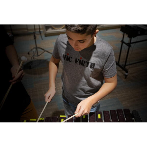 A Vic Firth logo t-shirt for the young, aspiring drummer, this classic heathered gray crew-neck t-shirt is made from soft, breathable tri-blend fabric. Featuring the Vic Firth logo across the chest and The Perfect Pair tagline below the back collar, with a woven loop Vic Firth flag tag on the bottom hem. In youth sizing designed to fit children ages 8-16 years, this is a perfect gift for a young drummer.